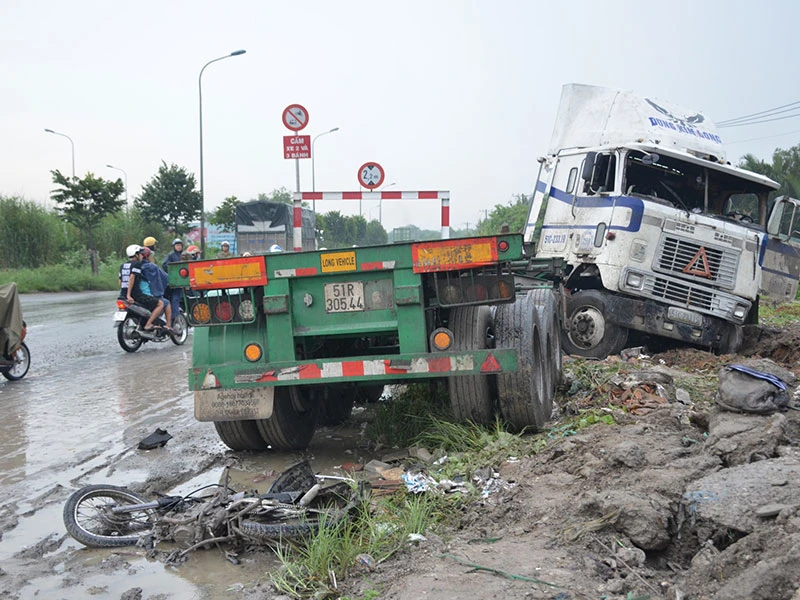 Khi vừa đổ xuống hết dốc cầu (phường Thạnh Mỹ Lợi, quận 2) container này bất ngờ lao qua phải, tông và kéo lê hai xe máy chạy cùng chiều.