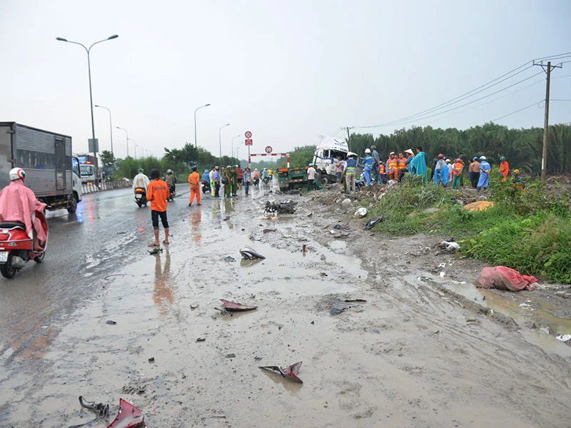 Tại hiện trường, hai xe máy dập nát, đầu xe container cũng bị hư hỏng nặng, xoay ngược trở lại so với hướng di chuyển. Giao thông qua khu vực gặp khó khăn.