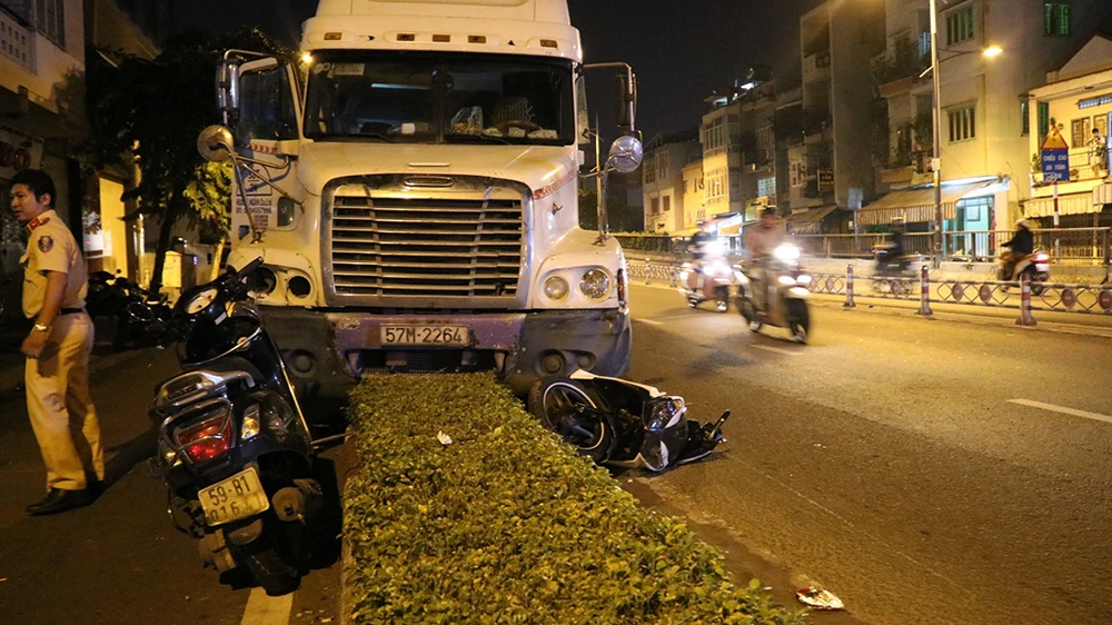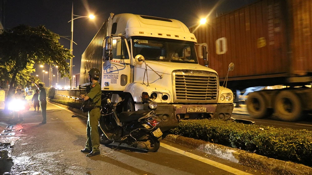 Khuya 30-9, xe container do tài xế chừng 35 tuổi điều khiển qua cầu Nguyễn Văn Cừ vào trung tâm TP.HCM với tốc độ khá cao. Khi đang đổ dốc thì bất ngờ tông trúng hai xe máy, cuốn các phương tiện này vào gầm.