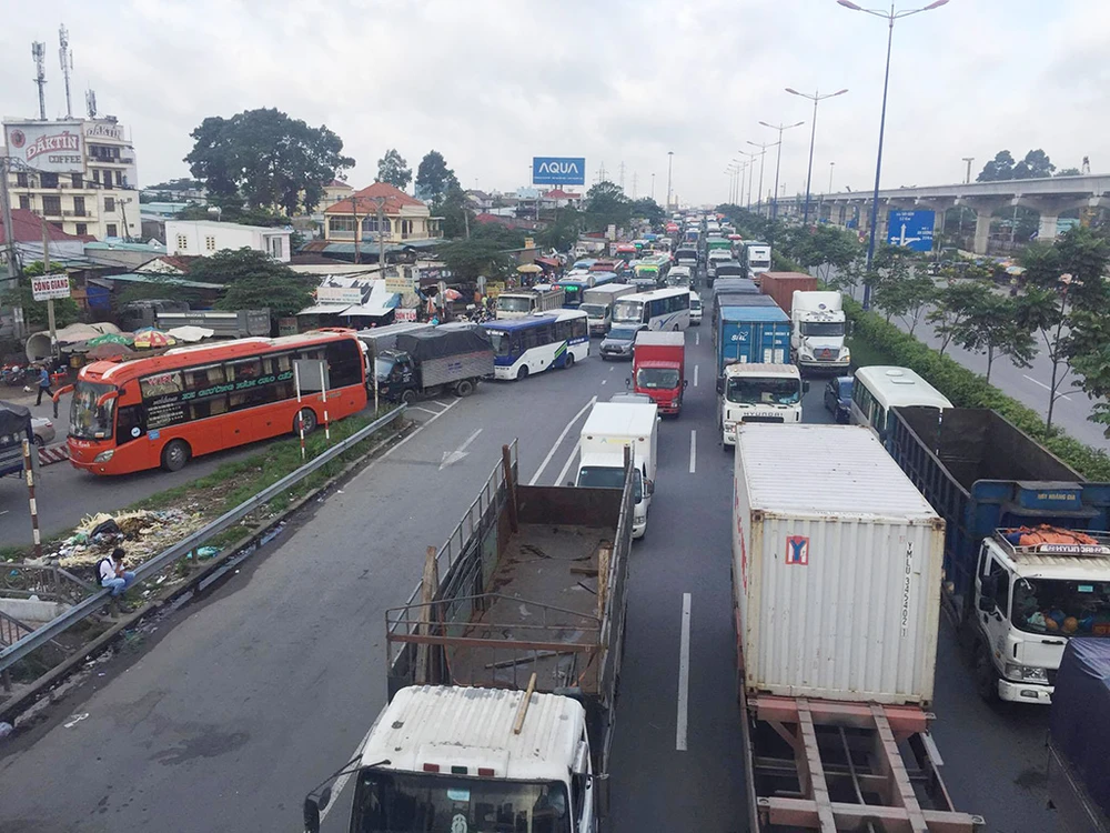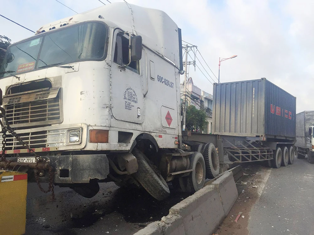 Tại hiện trường, container chắn ngang đường, nhiều dải phân cách bê tông văng tung tóe khiến giao thông qua khu vực kẹt cứng đúng giờ cao điểm; hàng ngàn phương tiện nối đuôi trên quốc lộ.