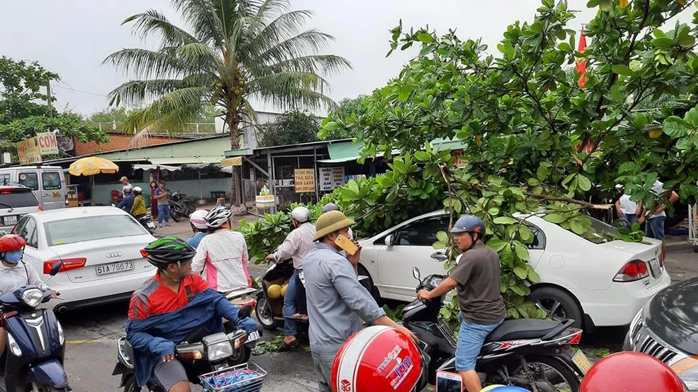 Cành cây lớn rơi trúng ô tô bên dưới khiến nhiều người hoảng hốt. Ảnh HT.