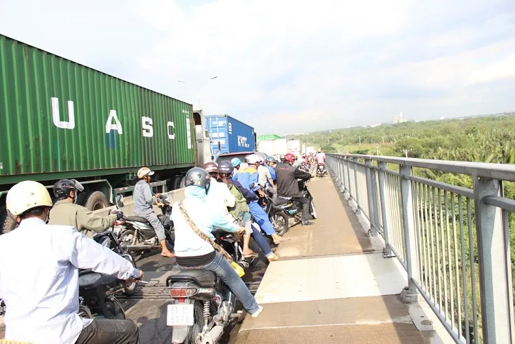 Tại hiện trường, trụ điện gãy đổ. Nhiều khối bê tông dải phân cách bị ủi nát. Tài xế may mắn thoát nạn nhưng container hư hỏng phần đầu. Ngoài ra, các tuyến giao thông trên cầu Phú Mỹ hai hướng quận 7 về quận 2 và ngược lại tắc nghẽn. Tại đây, xe cộ muốn đi qua cầu Phú Mỹ phải leo lên bậc thềm dành cho người đi bộ, tài xế xe khách, ô tô, xe tải nằm chờ, ngủ gục trong cabin.