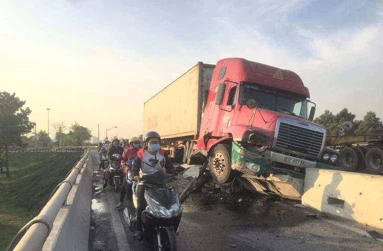 Khoảng 6 giờ sáng 20-3 xe container 63C - 057... chạy trên QL1 theo hướng từ quận Thủ Đức về quận 12. Khi lên gần giữa cầu vượt trạm 2 (quận 9, TP.HCM), xe này đâm gãy biển báo rồi lao vào dải phân cách bằng bê tông.