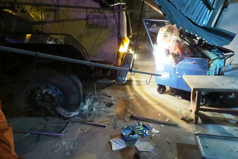 Chiếc xe đã tông sập một mái hiên cùng kệ bán hàng của gia đình ông Trần Hữu Khiêm (75 tuổi), làm hư hỏng nhẹ một mái hiên của căn nhà lân cận.