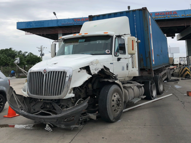 Tại hiện trường, đầu xe container bị hư hỏng nặng. Thời điểm trên, trạm thu phí cao tốc Trung Lương – TP HCM không thu phí, may mắn vụ tai nạn không gây thiệt hại về người.