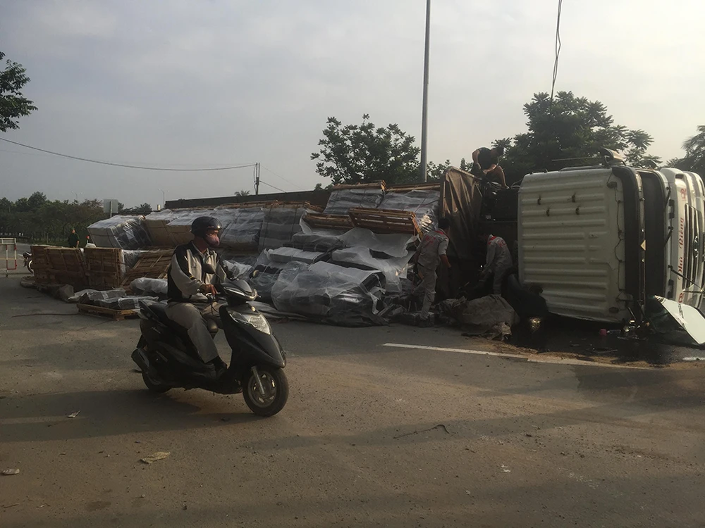 Khi đến cầu vượt Trạm 2, tài xế cho xe ôm cua tại đường nhánh (phường Linh Trung, quận Thủ Đức) thì xe bị lật nhào.