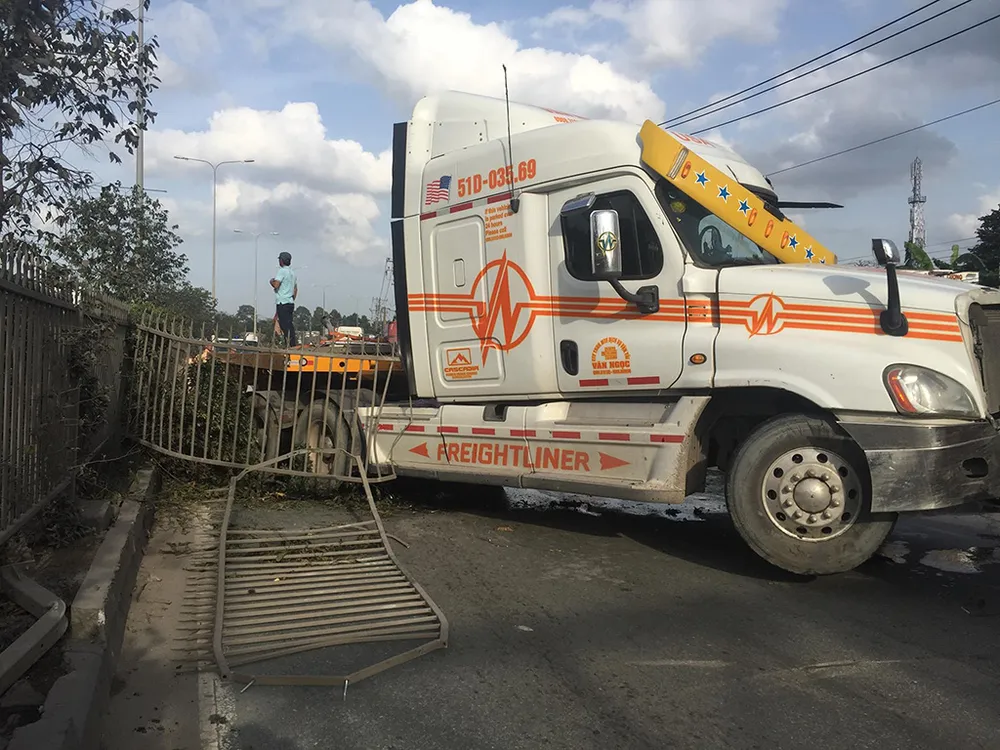 Tại hiện trường, đầu xe container hư hỏng nặng, dầu nhớt chảy tràn khắp nơi; nhiều mét dải phân cách thép bị tông biến dạng, văng khỏi vị trí.