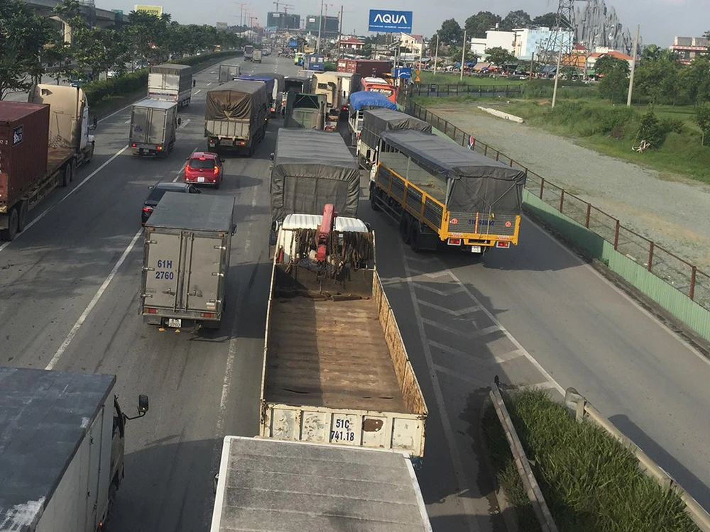 Chiều 29-7, xe container biển số TP.HCM chở cuộn sắt khoảng 20 tấn, lưu thông trên quốc lộ hướng từ cầu vượt Trạm 2 về cầu vượt Linh Xuân.