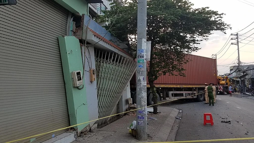 Chiếc container tông vào dãy nhà dân ở Bình Tân lúc rạng sáng. Ảnh HT.