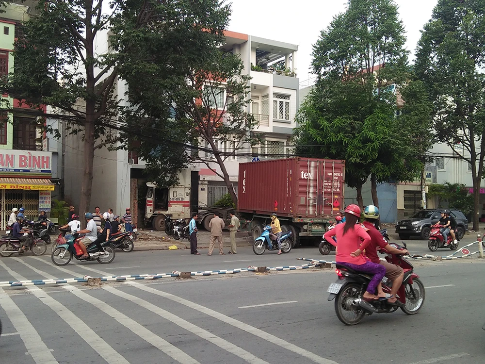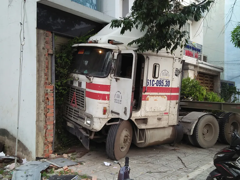 Vụ việc khiến container nằm chắn hết lối ra vào ngôi nhà ba tầng. May mắn những người trong gia đình đều ngủ trên lầu nên không có thiệt hại nào về người.