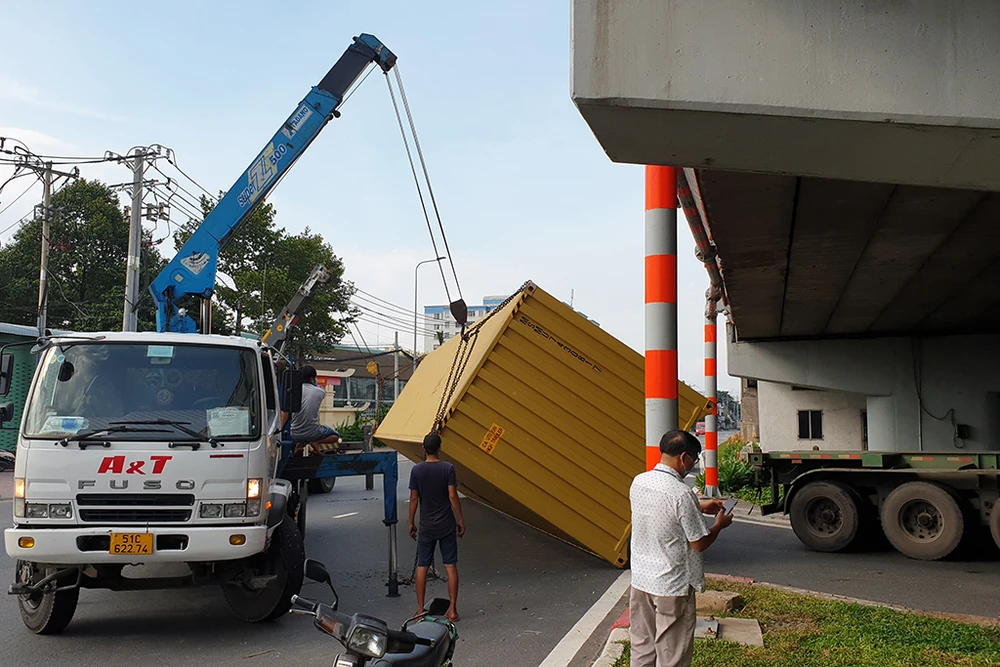 Hai xe cẩu được huy động tới di dời thùng container. Đến khoảng 4 giờ 30 phút cùng ngày, hiện trường đã được giải quyết.