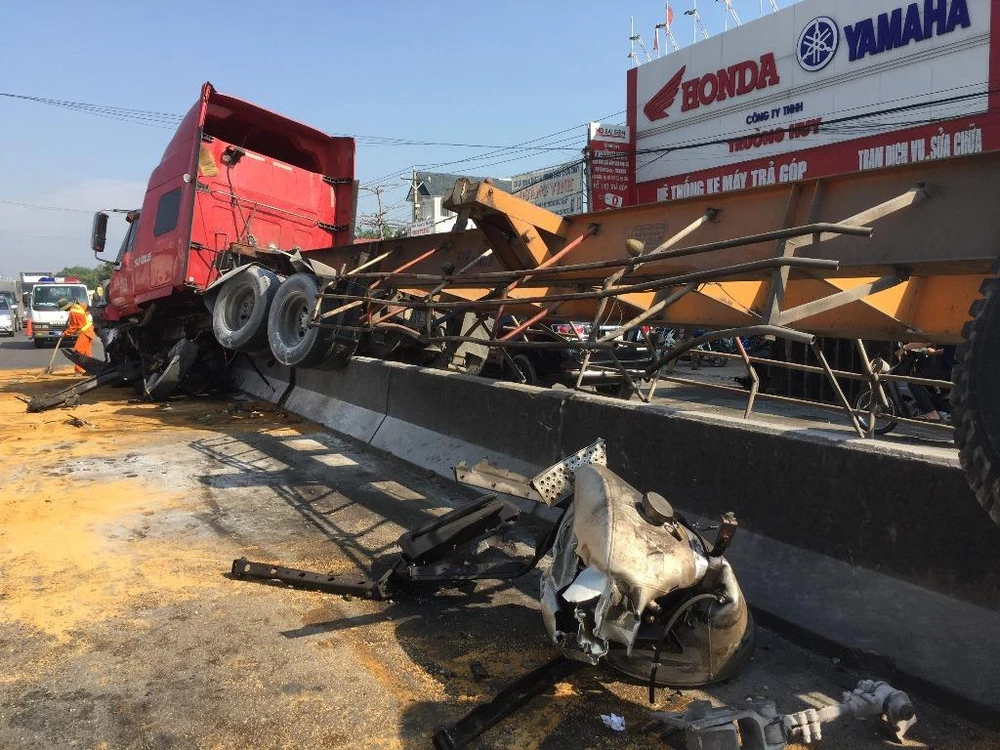 Tại hiện trường, hàng chục mét dải phân cách bị ủi nát, container nằm cheo leo trên đoạn phân cách kế tiếp, hư hỏng hoàn toàn, nhớt lênh láng khắp mặt đường.