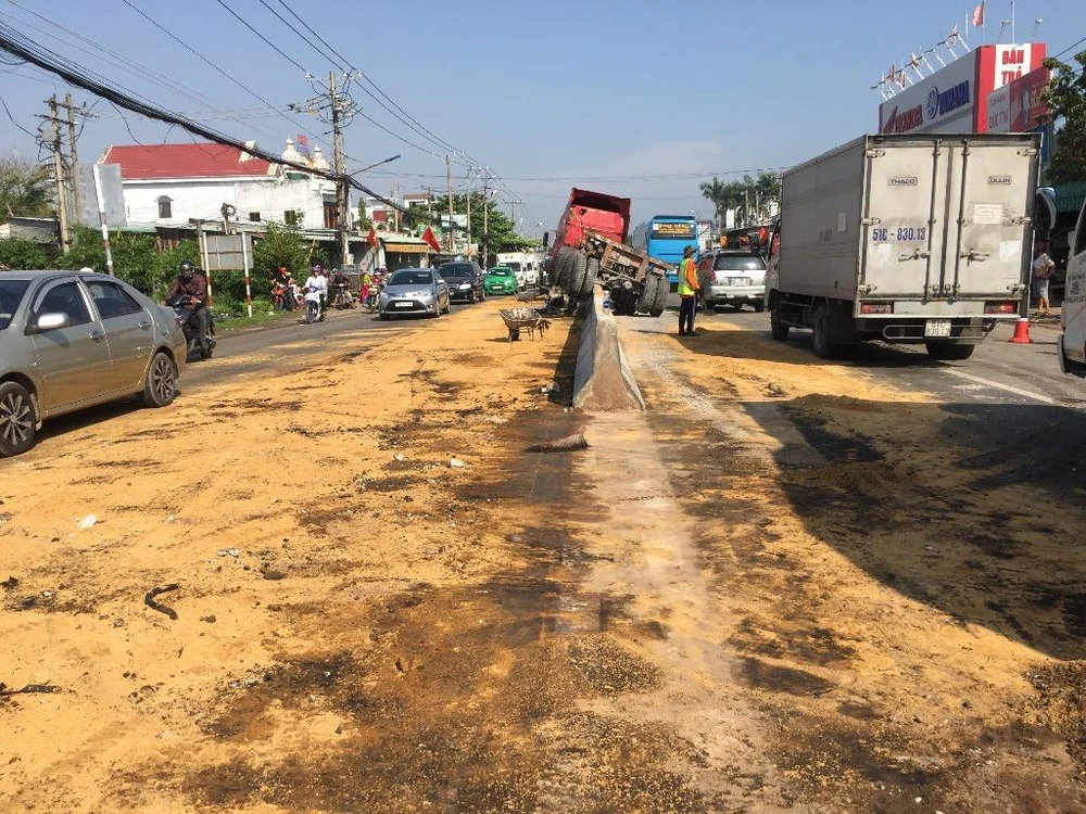 Lực lượng chức năng sau đó nhanh chóng có mặt xử lý vụ việc, ô tô chở cát được điều tới để khắc phục sự cố nhớt tràn, tránh trơn trượt.