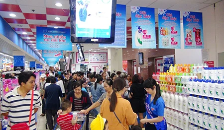 Thứ Năm (19-11): Nước rửa chén Lix siêu sạch hương chanh 4 kg giá bán chỉ 15.000 đồng/bình; sữa tắm Lifebuoy bảo vệ vượt trội túi 850/900 g giảm 40.000 đồng; kem đánh răng Aquafresh cavity 181,4 g giá bán chỉ 9.000 đồng/hộp; bột giặt Tide hương Downy 5 kg giảm 87.000 đồng…; Thứ Sáu (20-11): Sữa đậu nành nguyên chất Vinamilkhộp giấy 1L giá bán chỉ 5.000 đồng/2 hộp; cà phê hòa tan Vinacafe 3in1 Gold 24 x 20 g giá bán chỉ 5.000 đồng/gói; dầu ăn Neptune 2L giảm 46.400 đồng,… dành cho khách hàng có hóa đơn mua hàng từ 400.000 đồng.