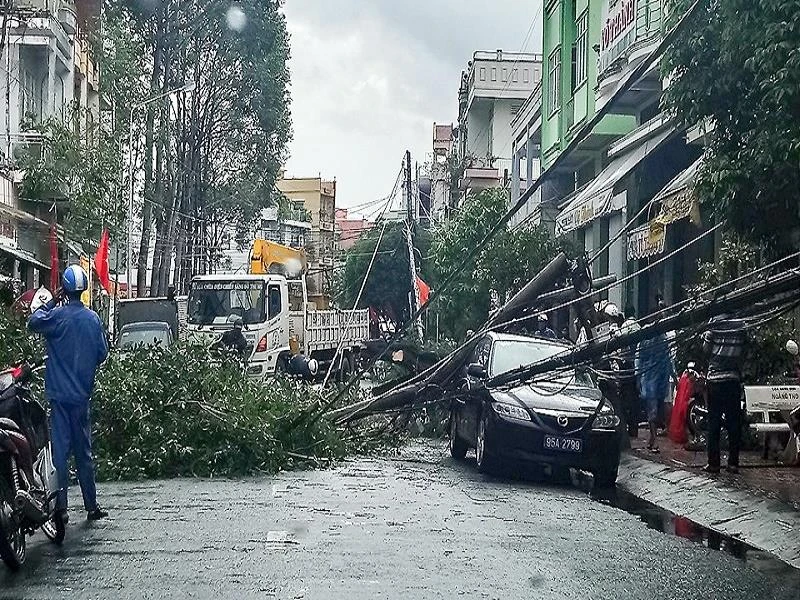 Trưa 2-9, một cơn mưa lớn kèm theo dông lốc làm cho một cây xanh trên đường Hải Thượng Lãn Ông (thuộc phường 1, TP Vị Thanh, tỉnh Hậu Giang) ngã đổ kéo theo một trụ điện cũng bị gãy đè lên một xe ô tô đang đậu gần đó.