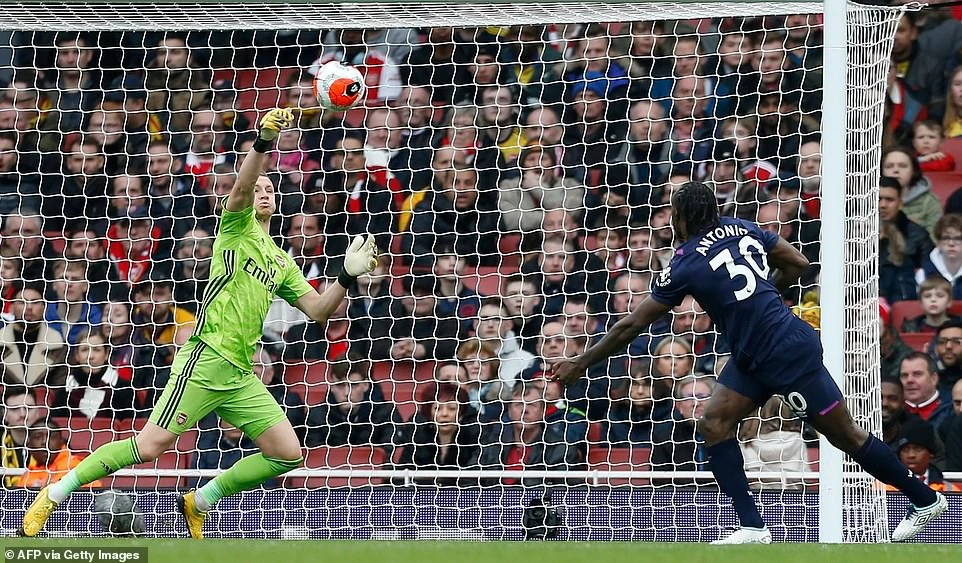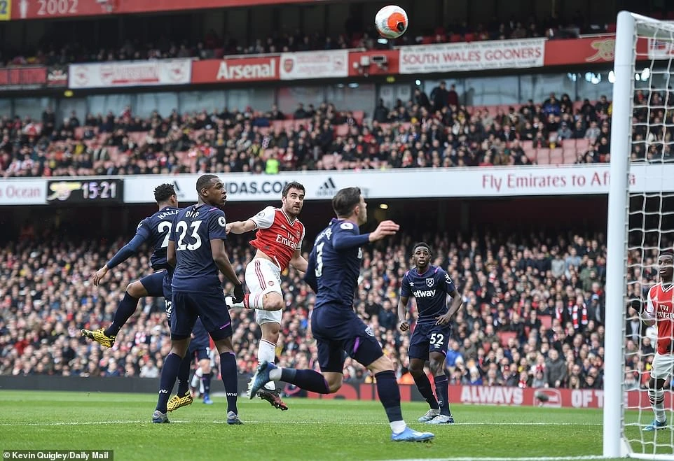 Trung vệ Sokratis có pha bật cao đánh đầu ở phút 22 nhưng bóng lại tìm đúng xà ngang khung thành của West Ham.