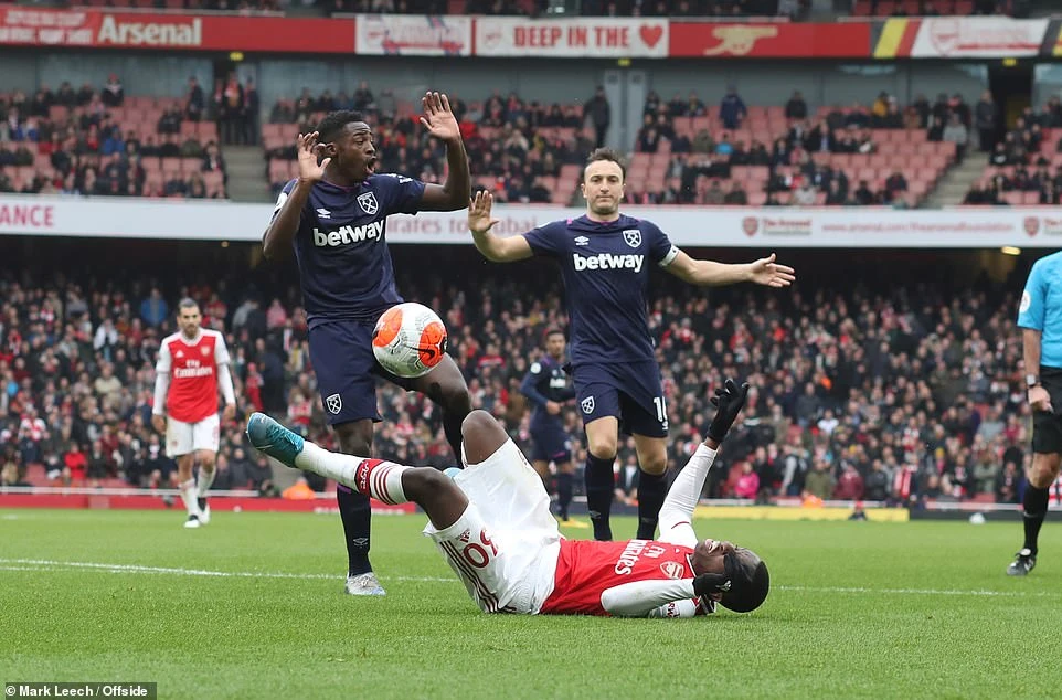 Phút bù giờ hiệp một, tiền đạo Nketiah té ngã trong vòng cấm nhưng Arsenal không được hưởng phạt đền.