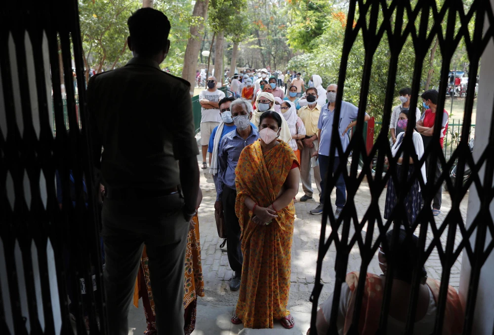 Người dân tại bang Uttar Pradesh xếp hàng bên ngoài một cơ sở tiêm chủng để chờ tiêm vaccine ngừa COVID-19. Ảnh: AP