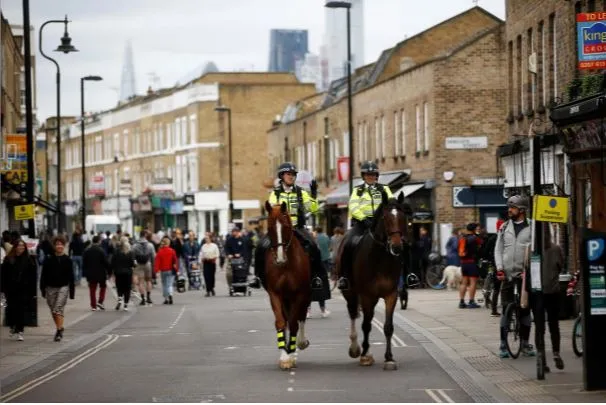 Cảnh sát cưỡi ngựa tuần tra tại khu chợ Broadway, London (Anh) ngày 3-5. Ảnh: REUTERS