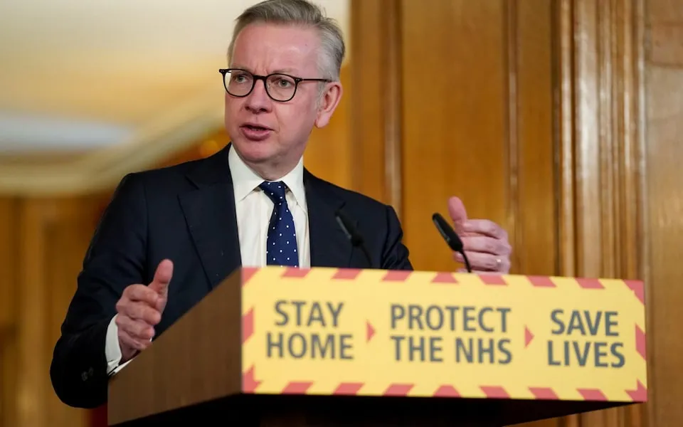 Bộ trưởng Văn phòng Nội các Michael Gove trong một phiên họp báo về tình hình đại dịch COVID-19 tại Anh. Ảnh: THE TELEGRAPH