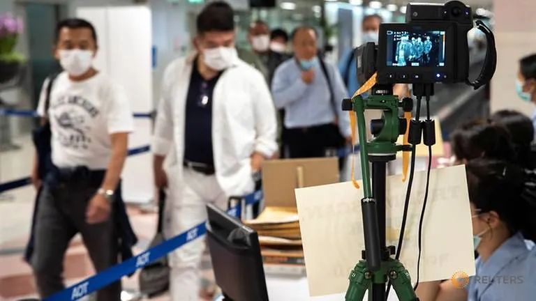 Máy đo nhiệt độ hành khách tại khu nhập cảnh sân bay quốc tế Suvarnabhumi ở Bangkok (Thái Lan) ngày 14-3. Ảnh: REUTERS