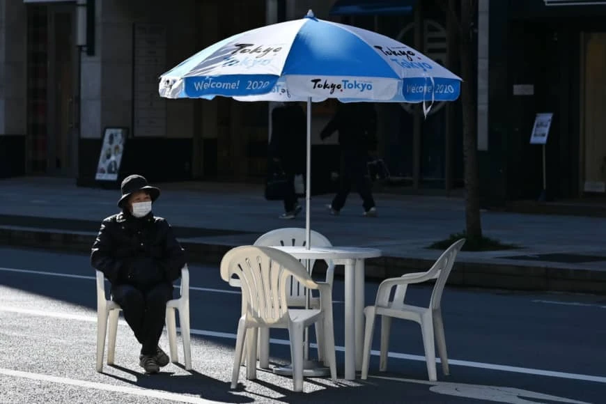 Một cụ bà ngồi lặng lẽ bên đường phố Tokyo ngày 15-3. Ảnh: JAPAN TIMES