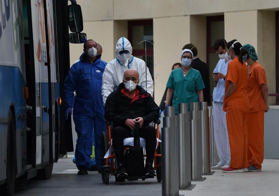 Một bệnh nhân được chuyển từ BV Gregorio Marinon đến bệnh viện dã chiến IFEMA do tình trạng sức khỏe tốt dần. Ảnh: INDEPENDENT