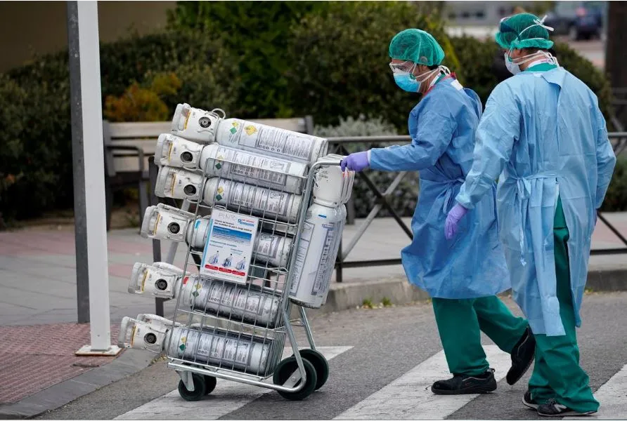Nhân viên y tế di chuyển bình ôxy tại một bệnh viện ở Madrid (Tây Ban Nha) ngày 30-3. Ảnh: REUTERS