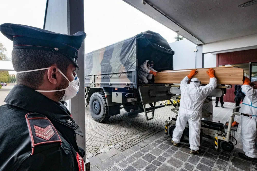 Binh sĩ Ý vận chuyển quan tài người chết vì COVID-19 đến một nghĩa trang gần TP Milan, vùng Lombardy (Bắc Ý) ngày 27-3. Ảnh: EPA