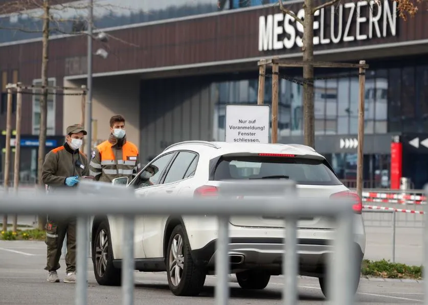 Nhân viên bảo vệ dân sự kiểm tra giấy tờ người dân trước khi cho họ vào một trung tâm xét nghiệm COVID-19 ở Luzern (Thụy Sĩ) ngày 27-3. Ảnh: REUTERS
