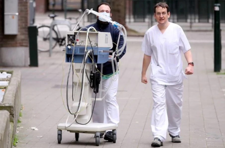 Nhân viên y tế di chuyển một máy trợ thở trong khuôn viên một bệnh viên ở thủ đô Brussels (Bỉ) ngày 20-3. Ảnh: REUTERS