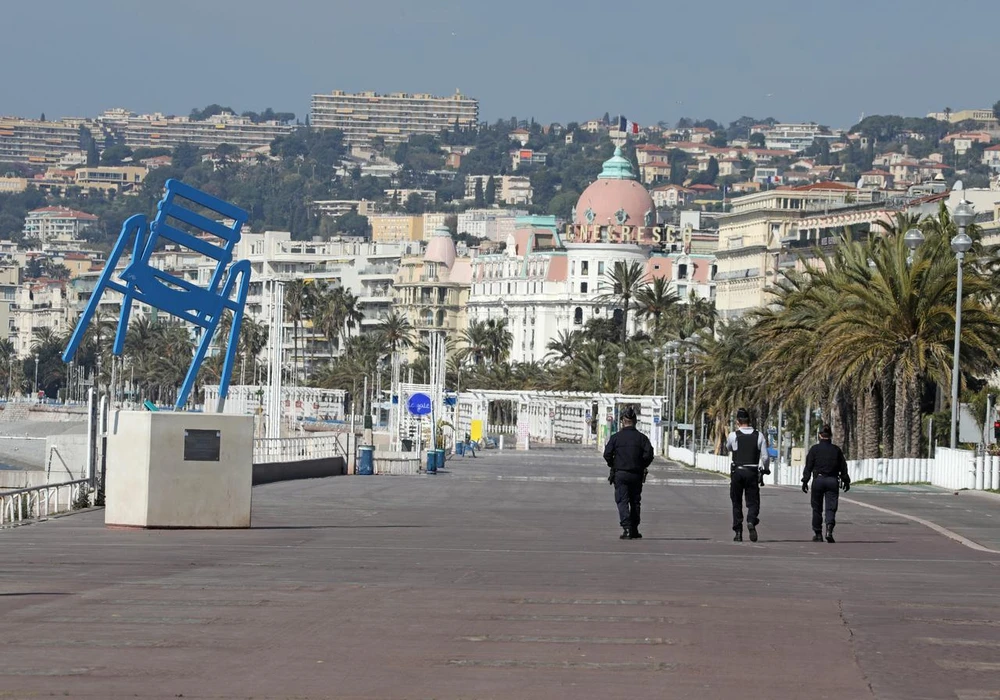 Cảnh sát TP Nice (Pháp) tuần tra ngày 12-4, trong thời gian nước này đang áp dụng lệnh phong tỏa phòng dịch COVID-19. Ảnh: REUTERS