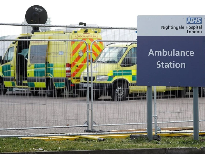 Xe cấp cứu chờ sẵn bên ngoài BV dã chiến NHS Nightingale ở London, Anh. Ảnh: AFP
