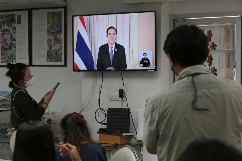 Phóng viên tại trụ sở chính phủ theo dõi Thủ tướng Prayut-o-cha tuyên bố sắc lệnh khẩn cấp trên truyền hình. Ảnh: BANGKOK POST