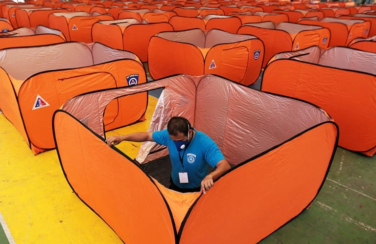 Dựng lều cách ly người nghi nhiễm trong một sân bóng rổ ở thủ đô Manila (Philippines) trong bối cảnh các bệnh viện quá tải. Ảnh: INQUIRER