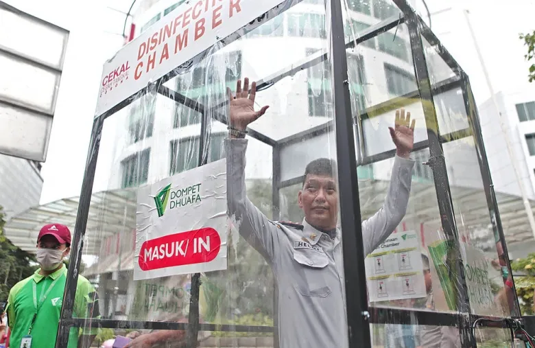 Một người đàn ông tự khử khuẩn mình tại một phòng khử khuẩn ở thủ đô Jakarta (Indonesia) do một tổ chức từ thiện dựng lên. Ảnh: JAKARTA POST
