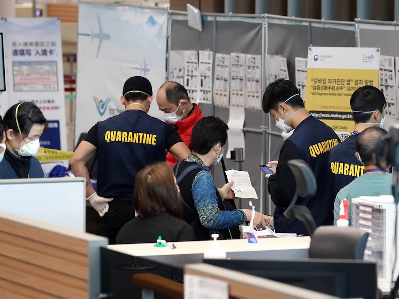 Người đến từ Nhật được nhập cảnh ở làn riêng, tuân theo quy định về hạn chế nhập cảnh để ngăn ngừa khả năng lây nhiễm COVID-19 từ các nước vào Hàn Quốc. Ảnh: YONHAP