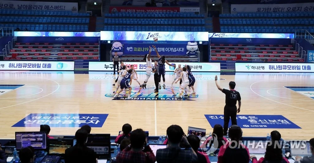 Các nữ vận động viên bóng rổ Hàn Quốc thi đấu ngày 9-3 trong sân đấu không có khán giả, trước khi giải đấu tạm nghỉ từ ngày 10-3. Ảnh: YONHAP