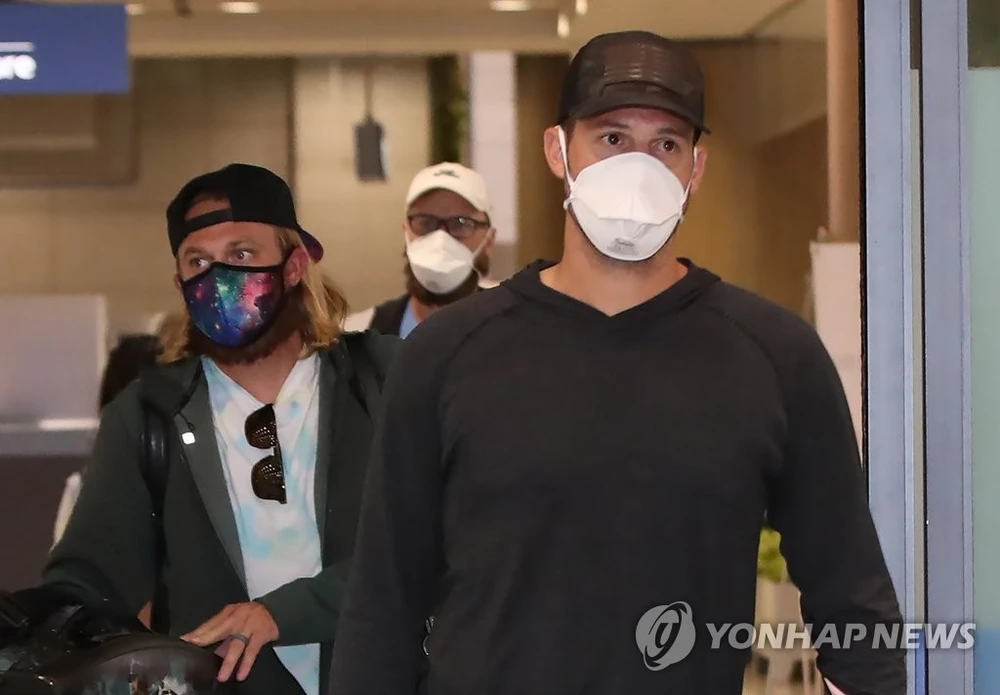 Cầu thủ bóng chày người Mỹ Jake Brigham (CLB Kiwoon Heroes) (phải) sẽ tự cách ly 14 ngày sau khi trở lại Hàn Quốc chuẩn bị cho mùa giải mới. Ảnh: YONHAP