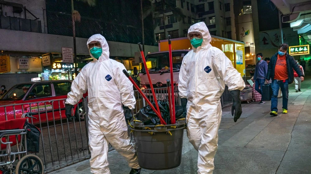 Nhân viên y tế di chuyển dụng cụ khử trùng trên đường phố Hong Kong (Ảnh chụp ngày 21-2). Ảnh: CNN
