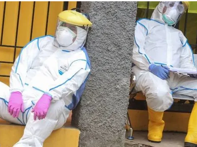 Hai nhân viên y tế Indonesia nghỉ mệt sau khi xét nghiệm cho một nhóm người ở thành phố Depok, Indonesia. Ảnh: REUTERS