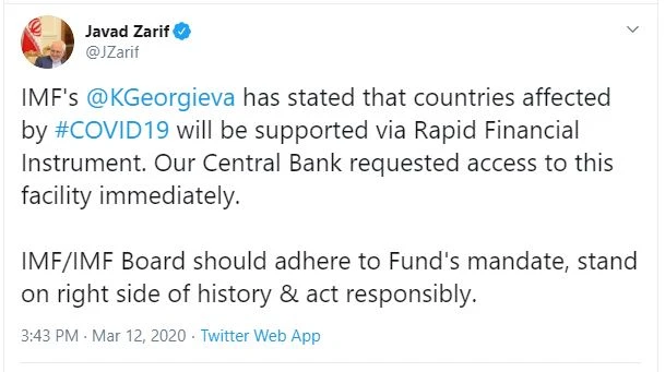 Twitter của Ngoại trưởng Zarif có phần nói về việc IMF nên đứng về lẽ phải của lịch sử và hành động có trách nhiệm. Ảnh: TWITTER