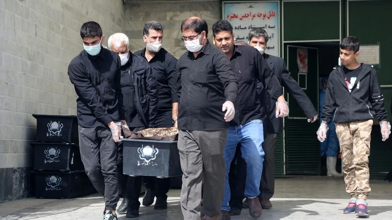 Một cỗ quan tài của bệnh nhân COVID-19 được khiêng đi tại nghĩa trang Beheshte Masoumeh ở TP Qom (Iran). Ảnh: GETTY