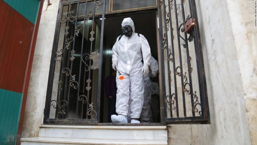 Các thành viên tổ chức Mũ bảo hiểm trắng xịt khử trùng ở Idlib. Ảnh: CNN