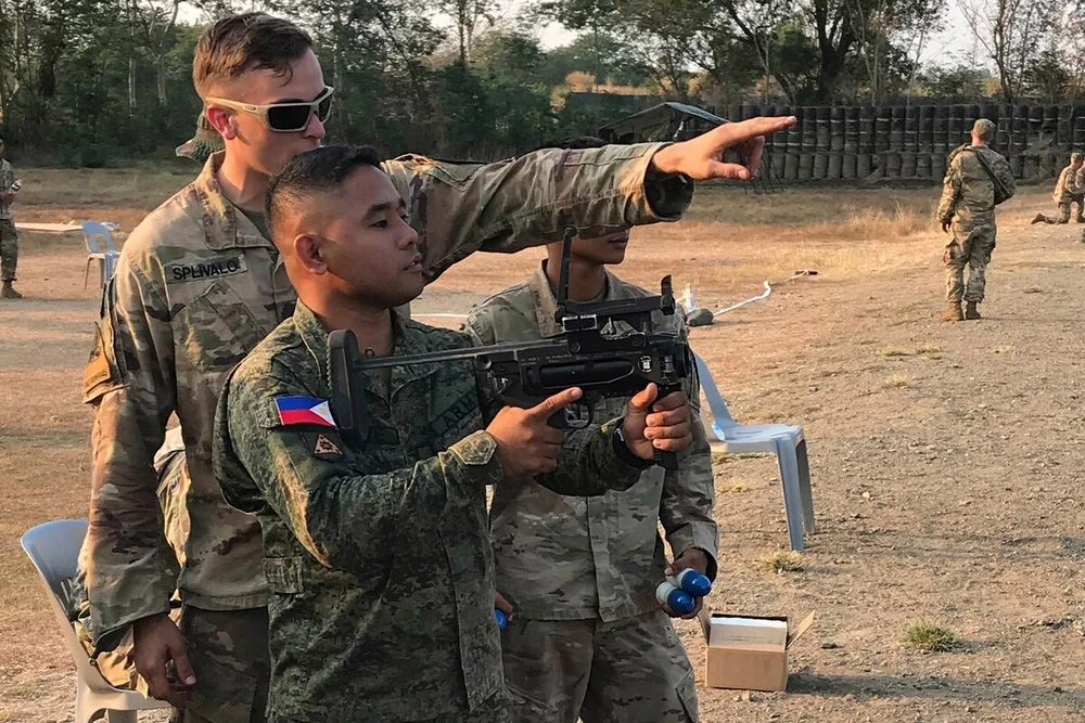 Một binh sĩ Mỹ huấn luyện cho một binh sĩ thuộc Lực lượng vũ trang Philippines cách vận hành phóng lựu M320 tháng 3-2019 tại tỉnh Nueva Ecija, Philippines. Ảnh: US MILITARY