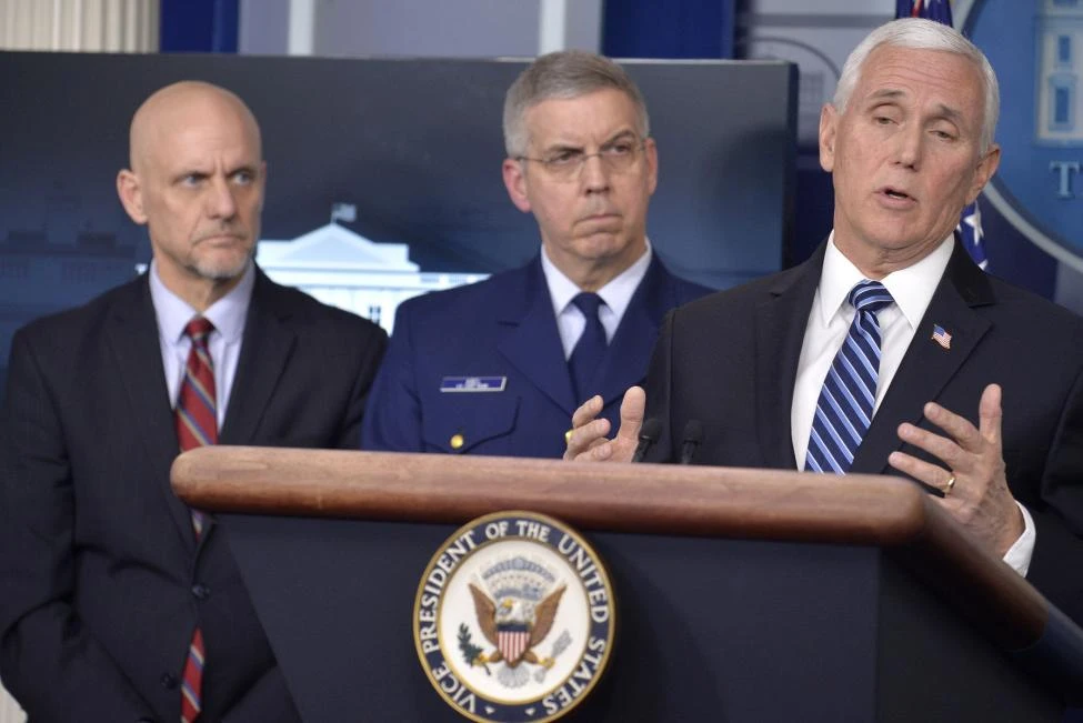 Phó Tổng thống Mỹ Mike Pence (bên phải) nói về 21 ca nhiễm COVID-19 trên tàu Grand Princess, ngày 6-3 tại Nhà Trắng. Ảnh: UPI