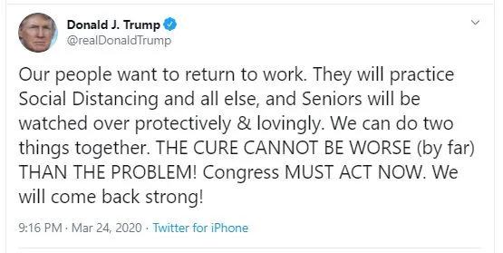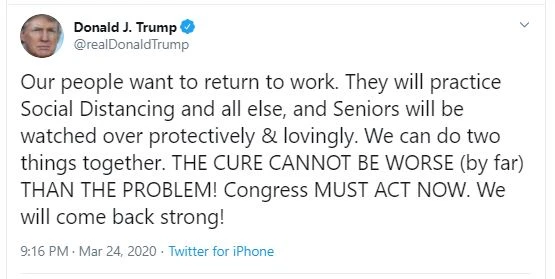 “Việc chữa bệnh không thể tệ hơn (cho đến nay) so với vấn đề kinh tế” - ông Trump viết trên Twitter hôm 24-3.