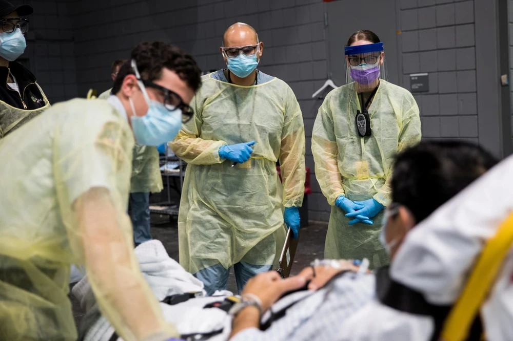 Quân y Mỹ hỗ trợ điều trị bệnh nhân COVID-19 tại trung tâm y tế Javis thuộc TP New York ngày 13-4. Ảnh: AFP