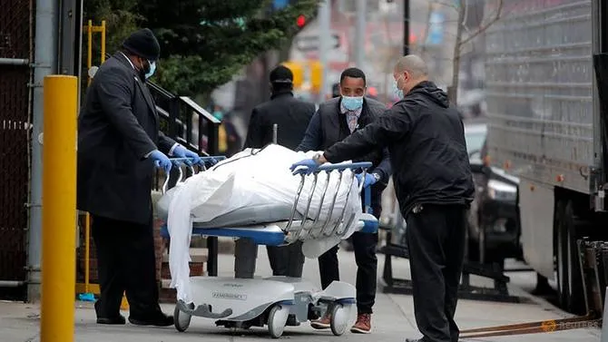 Các nhân viên đẩy một thi thể bên ngoài Bệnh viện Brooklyn ở New York (Mỹ). Ảnh: REUTERS