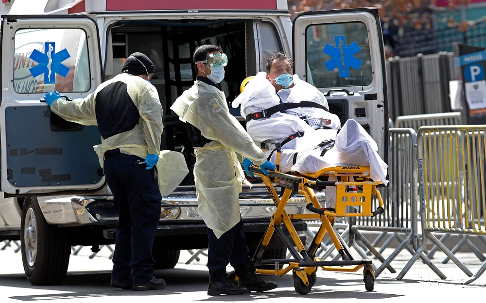Một bệnh nhân COVID-19 được đưa đến BV Elmhurst thuộc bang New York, Mỹ ngày 7-4. Ảnh: REUTERS